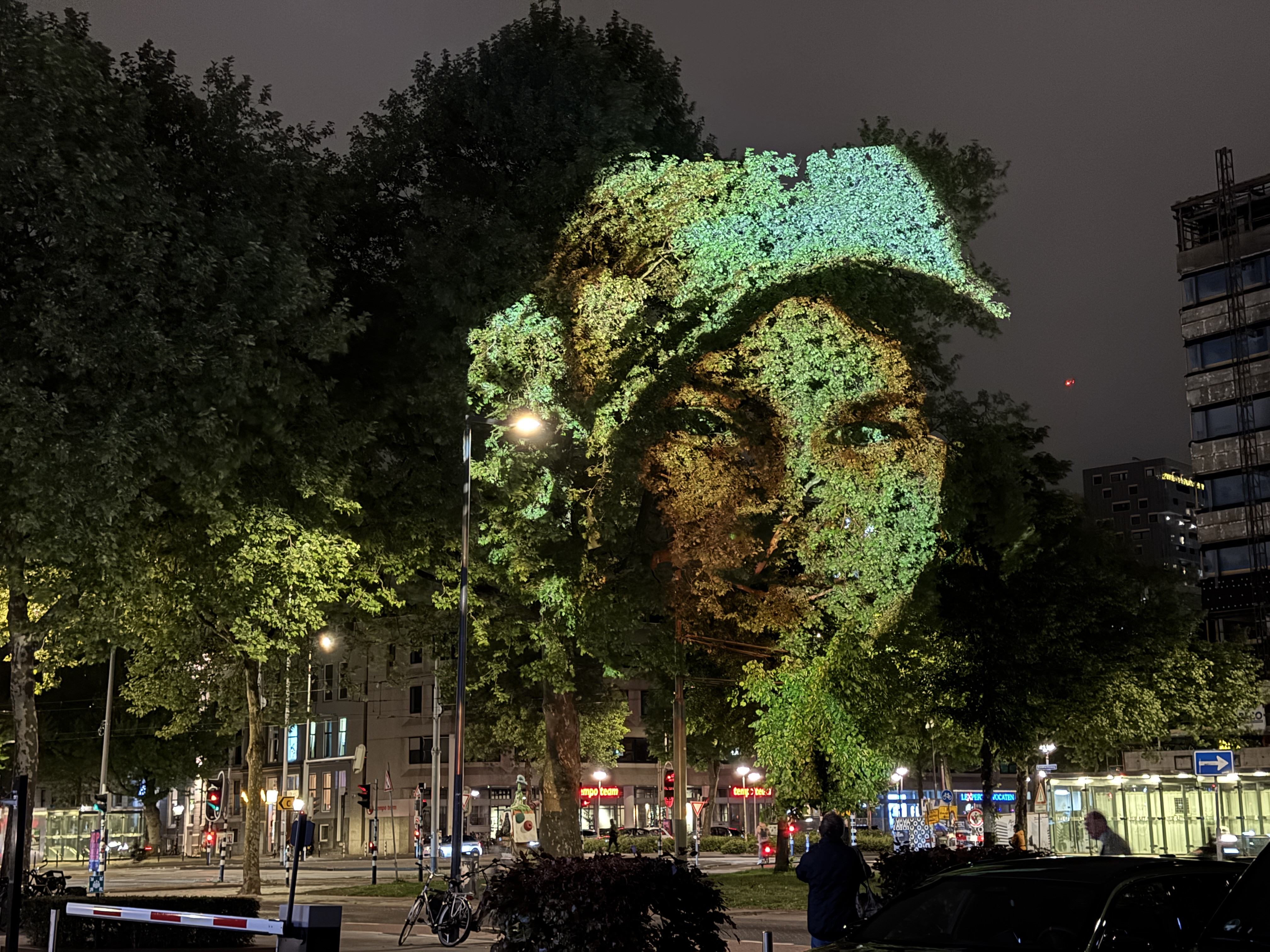 Op 6 mei was ook de eenmalige projectie op de grote plataan tegenover het parkhotel. De bladeren van de oude boom zorgden voor een poëtische omlijsting van alle namen en een aantal gezichten van de slachtoffers van het bombardement.